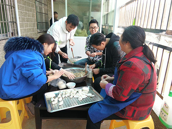 炊事組拿出提前備好的餃子餡和面團,熱熱鬧鬧地包起餃子。志愿者們嫻熟的拿起餃子皮,沾水、包餡、捏褶,準備午飯。