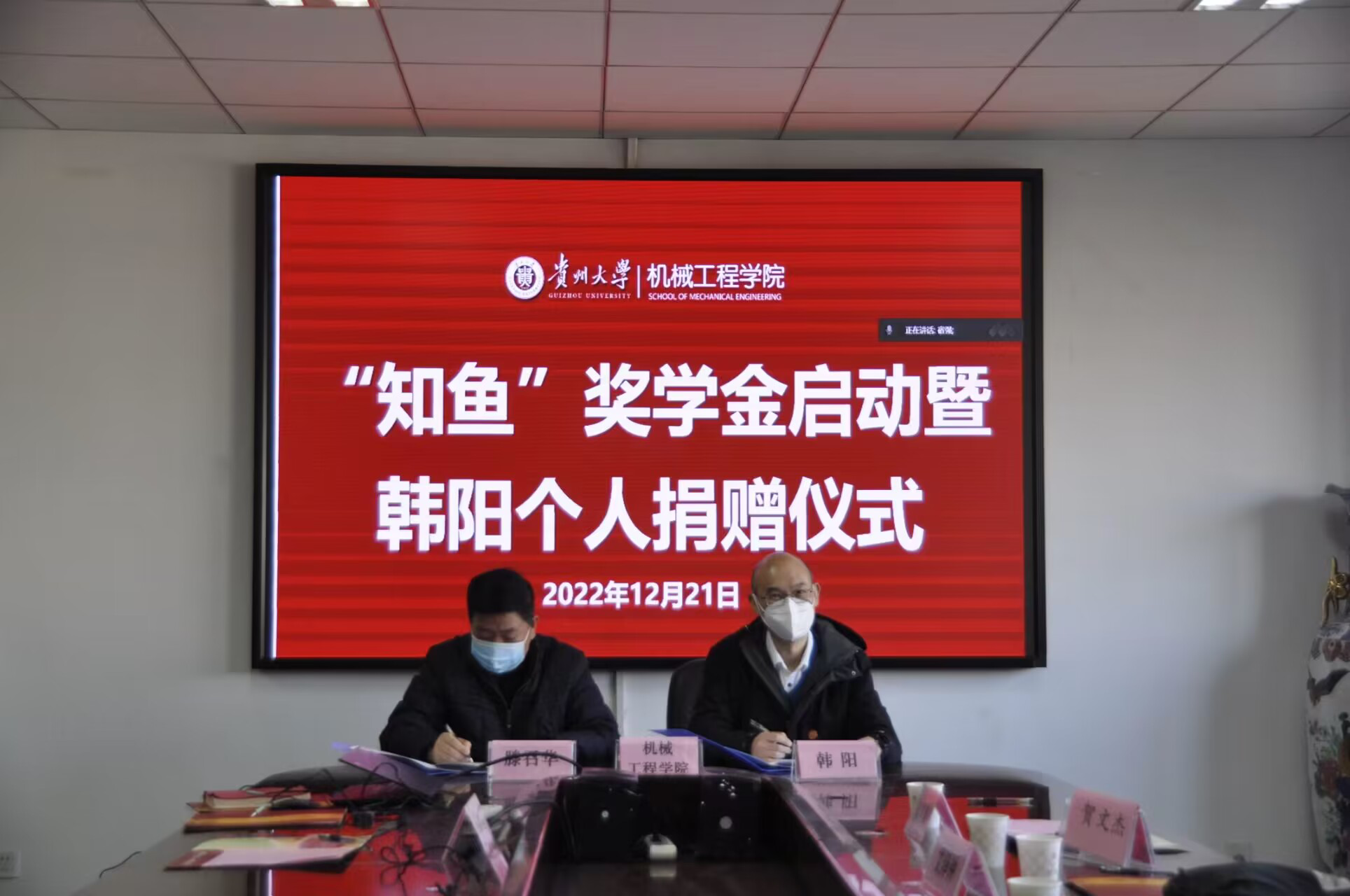 2022年12月21日上午10時,貴州大學機械工程學院聯合貴州捷盛鉆具股份有限公司在518會議室舉辦了“知魚”獎學金啟動暨韓陽個人捐贈儀式。院黨委書記滕召華、院長趙津、副院長何峰、科研與對外合作辦主要負責人、各專業系室中心主任,學生代表出席了本次捐贈儀式。