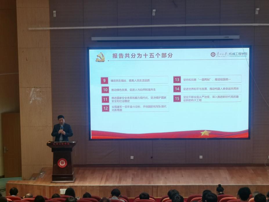 機械工程網(wǎng)站訊(記者朱漫華|攝影高鑫 路耀凌)為深入學(xué)習(xí)宣傳貫徹黨的二十大精神,教育引導(dǎo)學(xué)院黨員師生把思想和行動統(tǒng)一到黨的二十大精神上來,2023年4月14日中午,機械工程學(xué)院黨委書記滕召華在機械樓圓形報告廳為全院黨員師生作黨的二十大精神宣講。學(xué)院院長趙津、黨委副書記廖燁出席會議,學(xué)院教職工黨員和學(xué)生黨員參加宣講會。