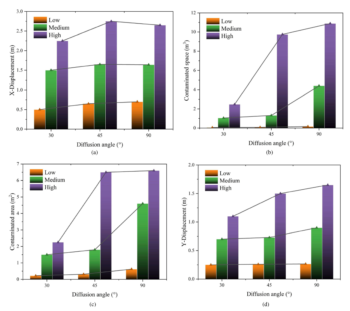 圖 15. 超聲波除垢儀的三種工作條件和三種初始擴(kuò)散角的不同組合對手術(shù)過程中大液滴顆粒的空間流動特性的影響粒子的空間流動特性的影響。(a) 飛濺距離的變化 (b) 污染空間的變化 (c) 飛濺沉積面積的變化 (d) 飛濺高度的變化。