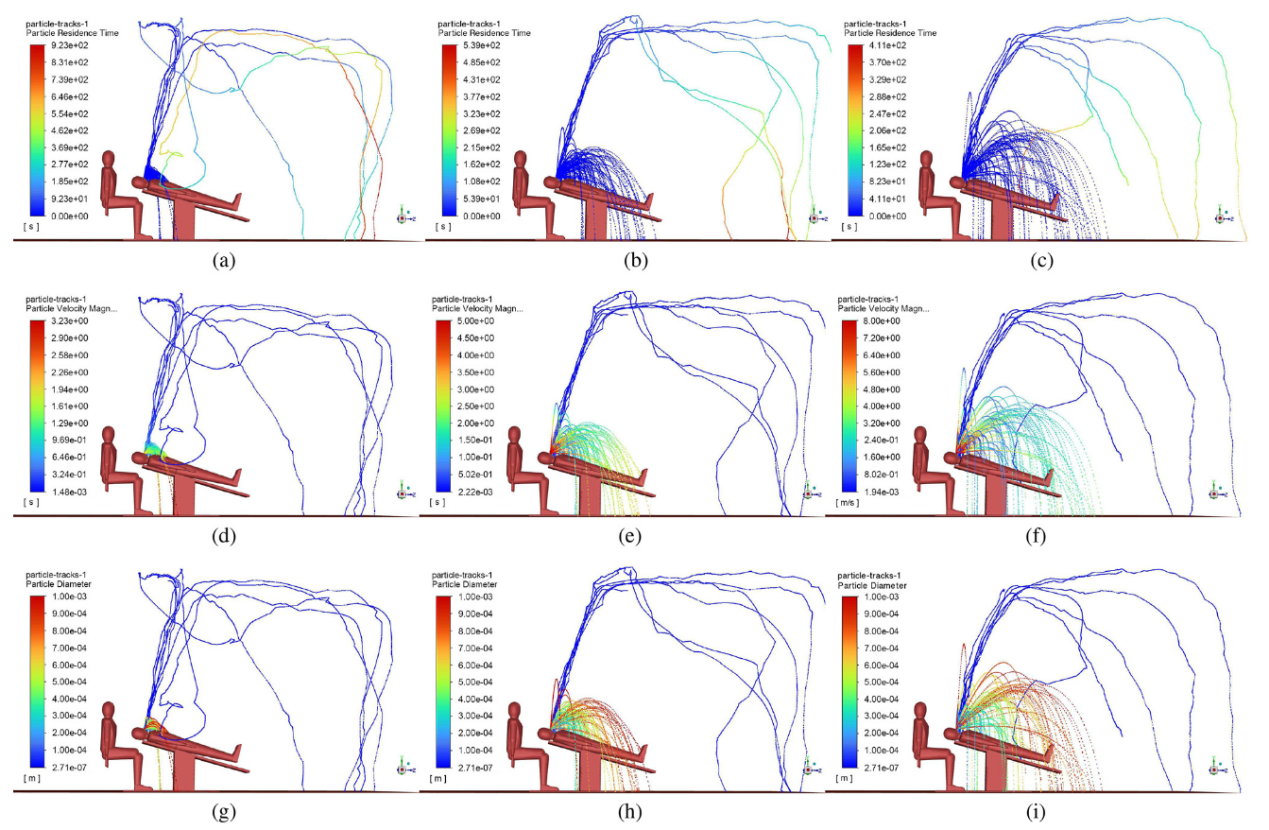 圖 3. 案例 7-9 分別模擬了在大初始噴射角下使用低、中、高功率引發(fā)的液滴流動。(a)-(c) 液滴顆粒在空氣中的停留時(shí)間;(d)-(f) 不同粒徑的液滴顆粒在空氣中的停留時(shí)間;(d)-(f) 不同粒徑液滴顆粒的速度分布;(g)-(i) 液滴顆粒的粒徑分布;