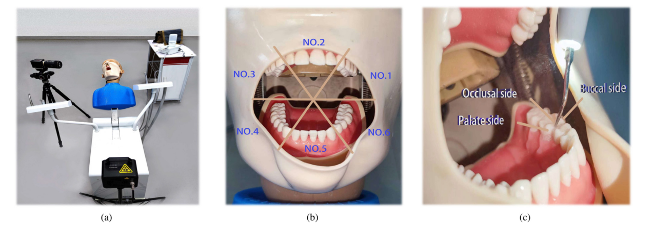 圖 1. (a) 實(shí)驗(yàn)場景示意圖,包括粒子測速設(shè)備、人體模型和超聲波潔牙機(jī);(b) 口腔牙齒分區(qū)示意圖,其中口腔內(nèi)的牙齒被分為六個(gè)主要區(qū)域;(c) 單顆牙齒分區(qū)示意圖,其中每顆牙齒被分為三個(gè)表面。(c) 單顆牙齒的分區(qū)圖,其中每顆牙齒分為三個(gè)表面、腭面、頰面和咬合面;