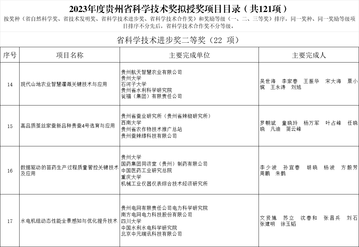 2024年3月,2023年度貴州省科技進步獎擬授獎項目公示發布,我支部書記周鵬同志所在團隊項目“數據驅動的苗藥生產過程質量管控關鍵技術及應用”獲貴州省科技進步二等獎(周鵬排名第六)。多年來,周鵬所在團隊與國藥集團同濟堂(貴州)制藥有限公司展開了深入而持久的合作,一同申報并完成了工信部智能制造新模式應用項目——中藥制劑全流程智能制造新模式應用。基于該項目的成功實施,項目成果獲2022年度教育部科技進步二等獎1項,并獲得中國國際大數據產業博覽會2023優秀科技成果、貴州省十大優秀科技成果等榮譽。