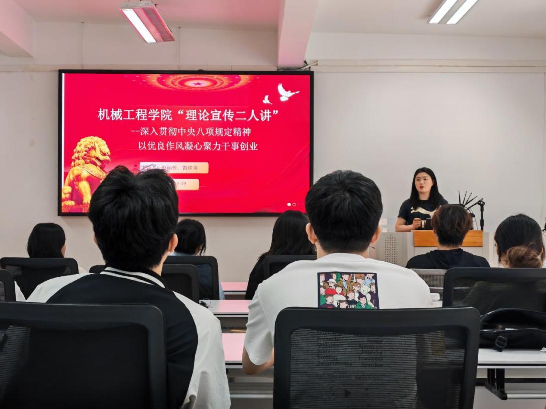 為深入貫徹中央八項規定精神學習教育,以優良作風凝心聚力、干事創業。5月 19日,機械工程學院本科生第三黨支部以中央八項規定為學習主題,開展“理論宣傳二人講”活動。