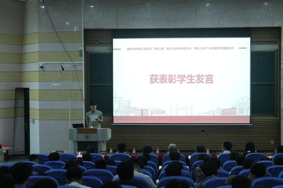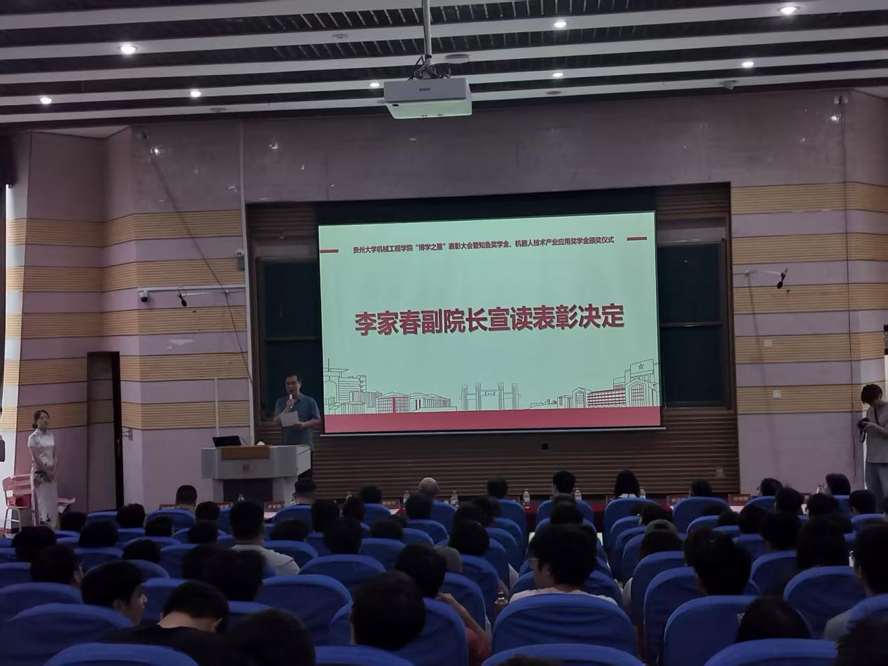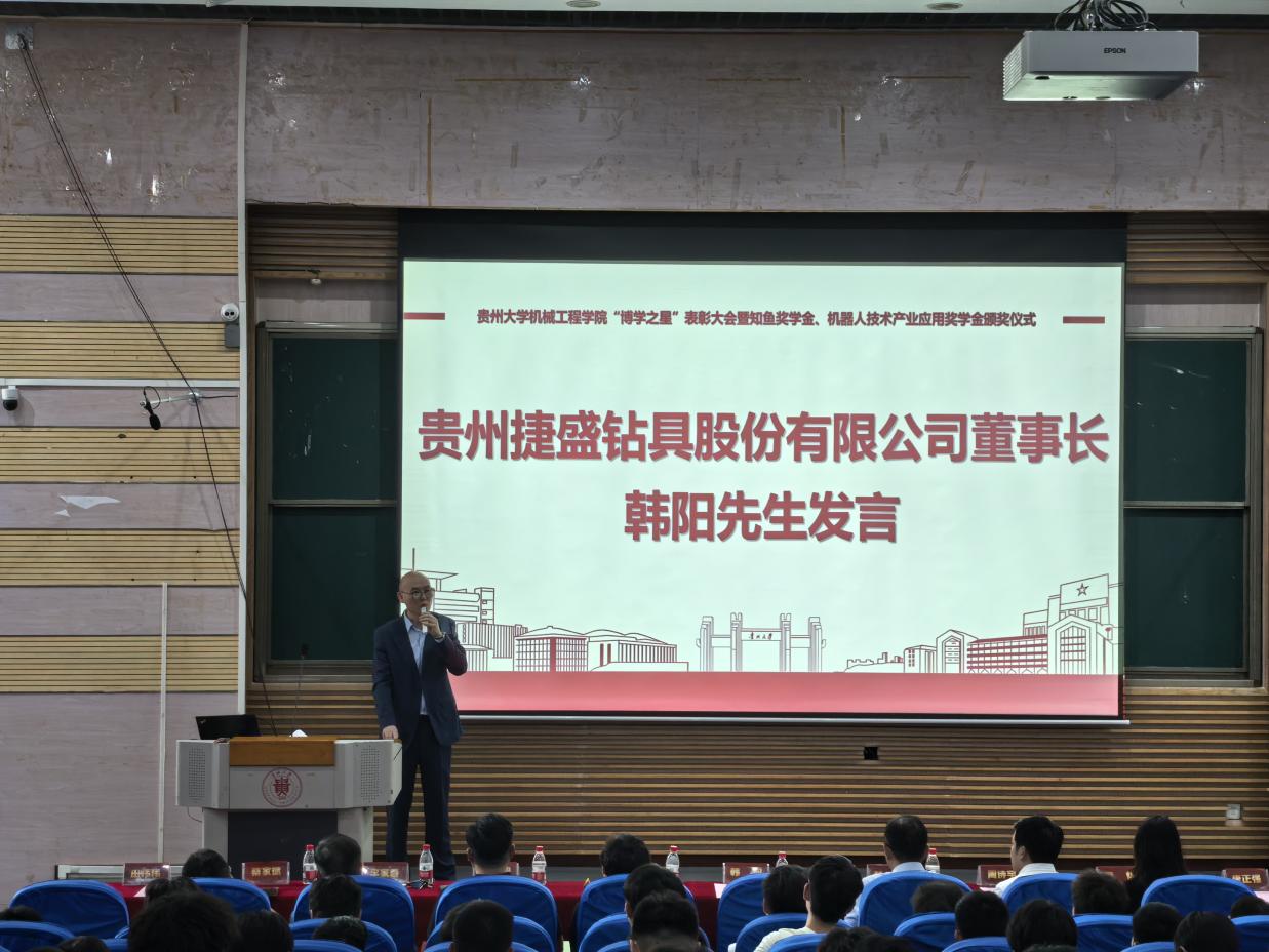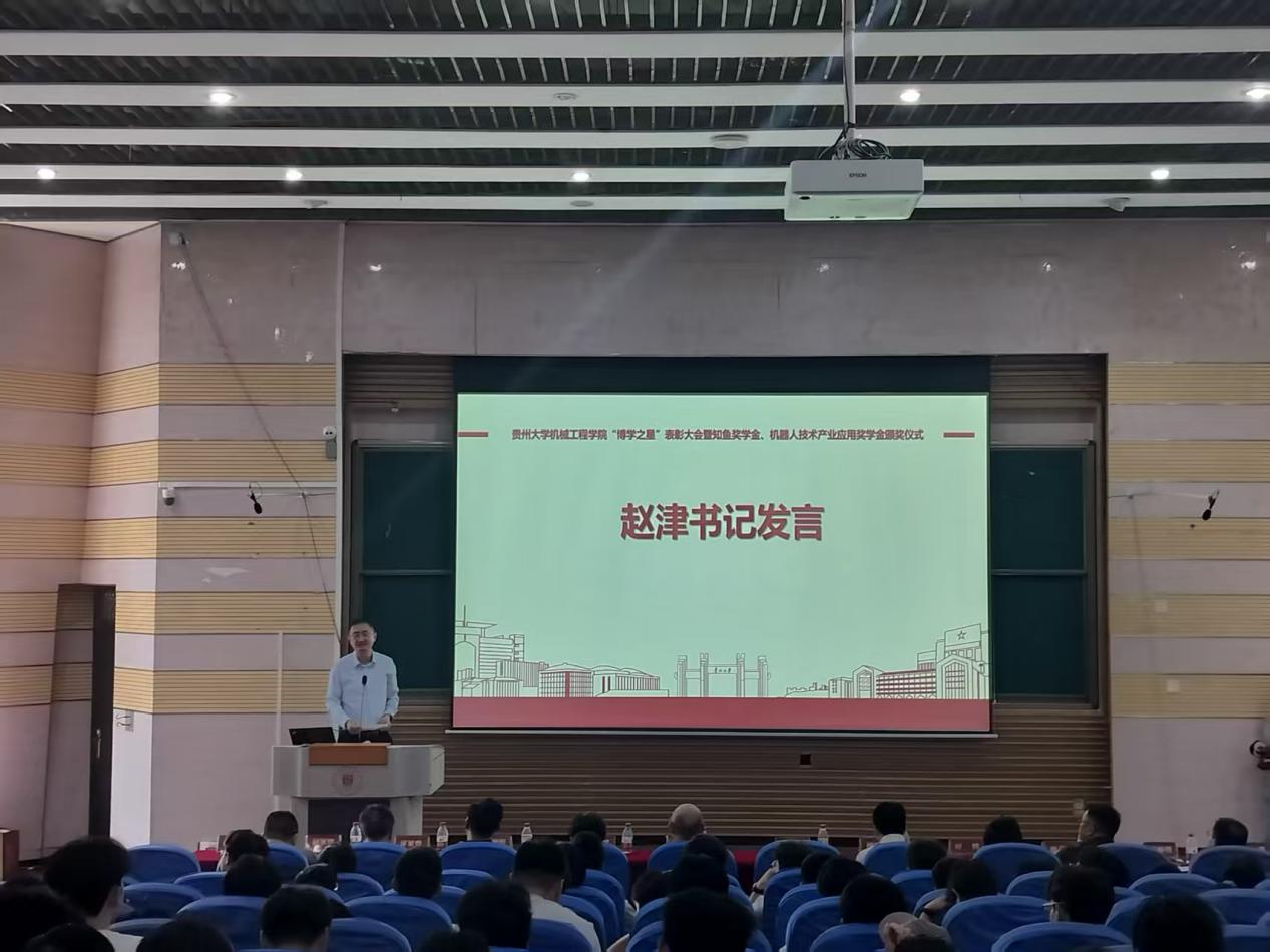 為表彰在學(xué)習(xí)成績(jī)、科研創(chuàng)新等方面有突出表現(xiàn)的畢業(yè)班同學(xué),2024年6月27日下午,貴州大學(xué)機(jī)械工程學(xué)院“博學(xué)之星”表彰大會(huì)暨知魚獎(jiǎng)學(xué)金、機(jī)器人技術(shù)產(chǎn)業(yè)應(yīng)用獎(jiǎng)學(xué)金頒獎(jiǎng)儀式在西校區(qū)117報(bào)告廳舉行。貴州捷盛鉆具股份有限公司董事長(zhǎng)韓陽(yáng)、重慶安尼森智能科技有限公司技術(shù)總監(jiān)周詩(shī)宇、貴州捷盛鉆具股份有限公司供應(yīng)鏈總監(jiān)安燕、國(guó)際業(yè)務(wù)二部部長(zhǎng)周舒毅、企劃部主管田偉偉與機(jī)械工程學(xué)院黨委書記趙津、正處級(jí)組織員董蔚然、黨委副書記廖燁、副院長(zhǎng)李家春、副院長(zhǎng)唐正強(qiáng)出席會(huì)議,學(xué)生科全體輔導(dǎo)員、獲獎(jiǎng)學(xué)生代表及兩百余名機(jī)械學(xué)子參會(huì),大會(huì)由學(xué)生科副科長(zhǎng)王嘉斌主持。