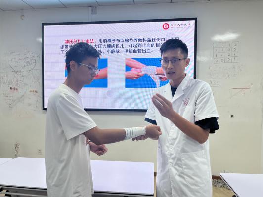 接著,姚云騫老師分享了關于“創傷救護”的急救知識。他普及一個“先救命,后治傷”的救護原則,并現場演示了直接壓迫止血,加壓包扎止血,8字包扎法,三角巾膝關節帶式包扎,骨折固定等救護方法。