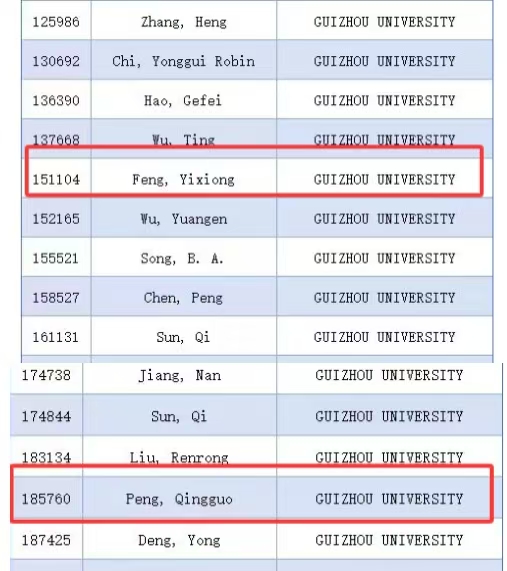2025年9月19日,美國斯坦福大學(Stanford University)與愛思唯爾(Elsevier)聯合發布了第八版《全球前2%頂尖科學家榜單2025》(World’s Top 2% Scientists 2025)。該榜單依托Scopus數據庫的引用數據進行系統分析,從全球近700萬名科學家中,依據“生涯影響力”和“年度影響力”兩項指標,遴選出世界排名前2%的頂尖科學家。其中,中國有12374位學者入選“終身榜”,31685位學者入選 “2025 年度榜”。我院馮毅雄教授、彭慶國副教授亦榜上有名,成功入選2025年全球前2%頂尖科學家“年度影響力”榜單,如圖1所示。