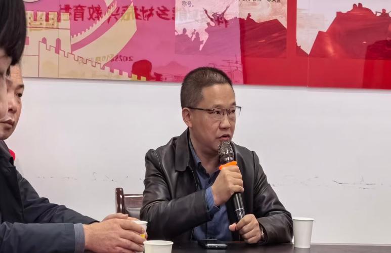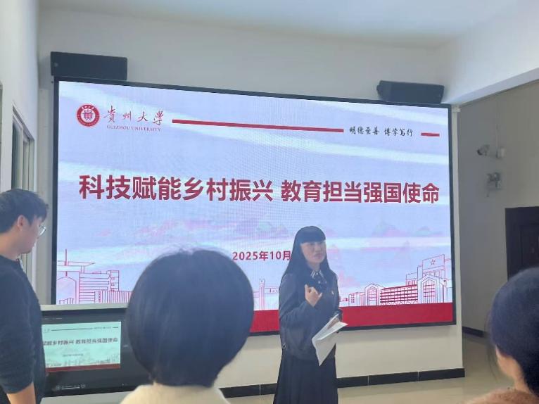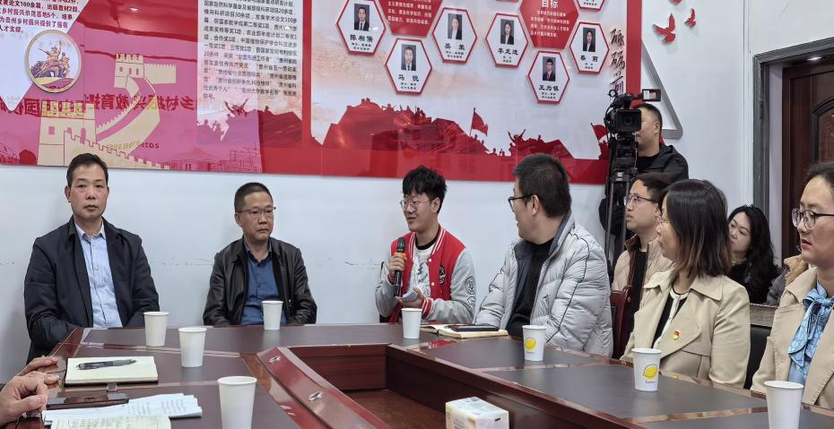 在“聽(tīng)·一線(xiàn)故事”環(huán)節(jié),全體人員移步至農(nóng)場(chǎng)會(huì)議室。大家首先觀看了“全國(guó)模范教師”、機(jī)械工程學(xué)院張富貴教授的紀(jì)錄片《田間富貴》,并聆聽(tīng)了張老師結(jié)合親身經(jīng)歷,講述如何將教育力量轉(zhuǎn)化為鄉(xiāng)村振興動(dòng)能的感人故事;隨后,全國(guó)先進(jìn)工作者、貴州大學(xué)教學(xué)實(shí)驗(yàn)農(nóng)場(chǎng)副場(chǎng)長(zhǎng)龍友華教授分享了自己如何通過(guò)科普活動(dòng)和科技培訓(xùn),幫助村民了解新技術(shù)、掌握新技能,讓科技真正成為推動(dòng)鄉(xiāng)村進(jìn)步的強(qiáng)大引擎。隨后的“1+3”圓桌對(duì)談中,學(xué)生黨員聚焦“傳承與成長(zhǎng)”、駐村隊(duì)員聚焦“實(shí)踐與賦能”、管理崗教師聚焦“協(xié)同與保障”,與張老師和龍老師展開(kāi)了深入的思想碰撞與交流。