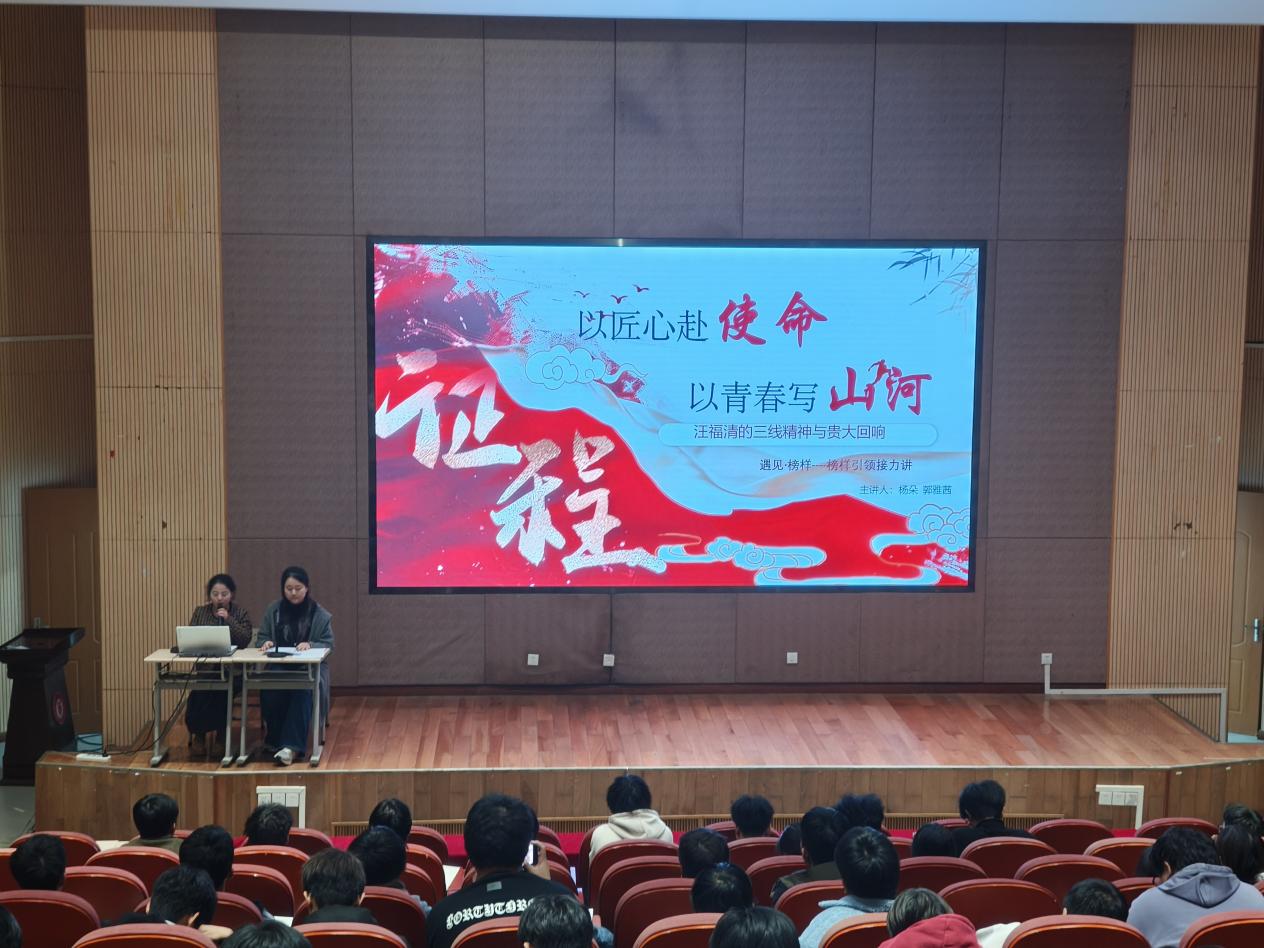 會議第一階段,楊朵老師與機械學子郭雅茜以接力宣講的形式,講述汪福清先生的感人事跡與奮斗精神。宣講中,師生二人回顧我院首任系主任汪福清教授在貴州大方羊場壩溶洞中組織研制中國第一臺航空發動機的艱辛歷程,號召學子以榜樣為鏡,接過接力棒,在機械工程領域書寫新時代篇章,堅定學子們傳承匠心、勇擔使命的信念。