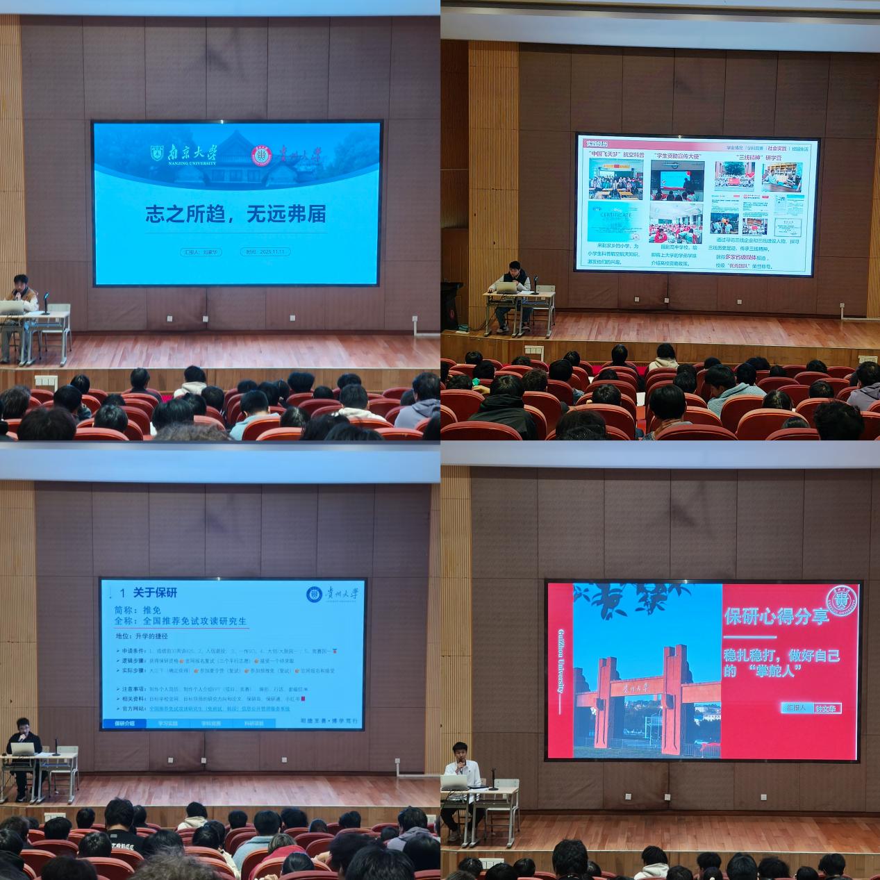 會議第二階段,四名保研學長結合自身經歷,從不同維度為學弟學妹們傳經送寶。分享內容涵蓋科研競賽、學業規劃、志愿服務、面試技巧及升學選擇等方面?;咏涣鳝h節,學弟學妹們就如何平衡學習與學生工作、如何準備競賽材料、如何應對面試壓力等問題踴躍提問,四位保研學長耐心解答。
